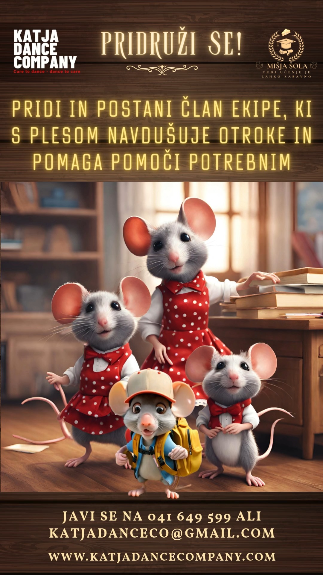 Plesna pravljica Mišja šola nam pokaže, da lahko na pravi način vsak začuti, da je učenje lahko tudi koristno; da ko nekdo zboli, potrebuje pomoč; in da je ljubezen zelo lepa, tako lepa, da celo nagajivčke začara.